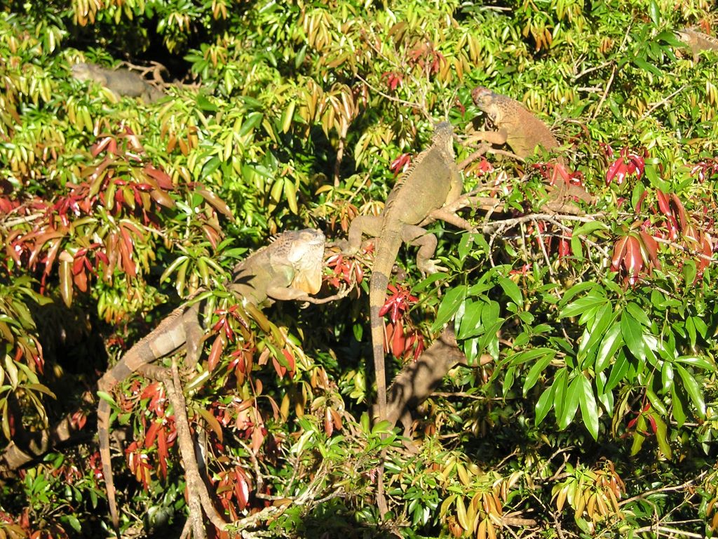 Wir fahren los in Richtung Los Chiles, einer Stadt nahe der Grenze von Nicaragua. Doch schon kurz nach dem Start wird wieder gestoppt. Wir halten an einer kleinen Brücke über einen schmalen Fluss. Im Tal des Flusses stehen Bäume und auf diesen Bäumen wachsen Warane, so scheint es zumindest. Der Baum an der Brücke ist voller Warane, die faul rumliegen und die Sonne genießen. Nach ein paar Fotos geht es weiter mit dem Bus.