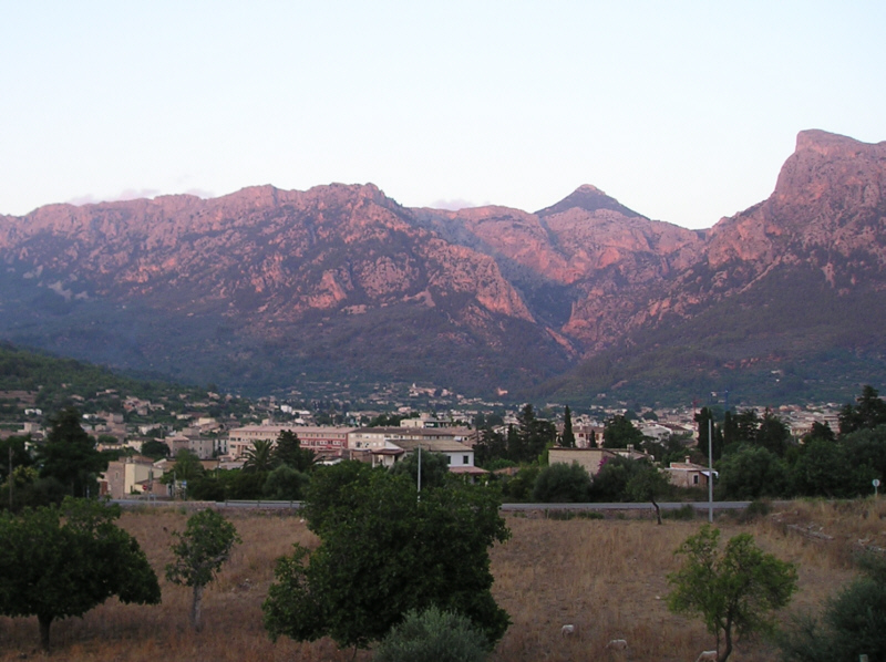 Nach dem Abendessen geht es auf einen Schlummertrunk nach Deià; einem der schönsten Städtchen an der Westküste. Als wir Sóller hinter uns lassen, färbt gerade die langsam untergehende Sonne die Tramuntana rot.